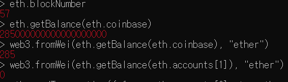- 채굴 종료후 계류된 트랜잭션은 없고 두번째 계좌(eth.accounts[1])에 10이더가 송금된 것을 확인