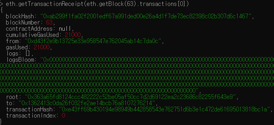 > eth.getTransactionReceipt(eth.getBlock(63).transactions[0])