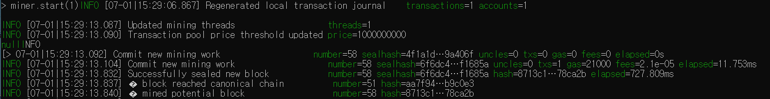 > miner.start(1) ⇐ 마이닝 시작 / 1은 스레드 개수( 스레드 개수가 많을 수록 블록을 빨리 만듬)