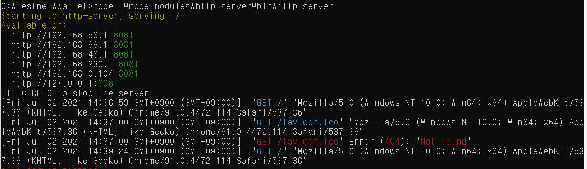 C:\testnet\wallet> npm install http-server ⇐ 테스트에 사용할 간단한 웹 서버