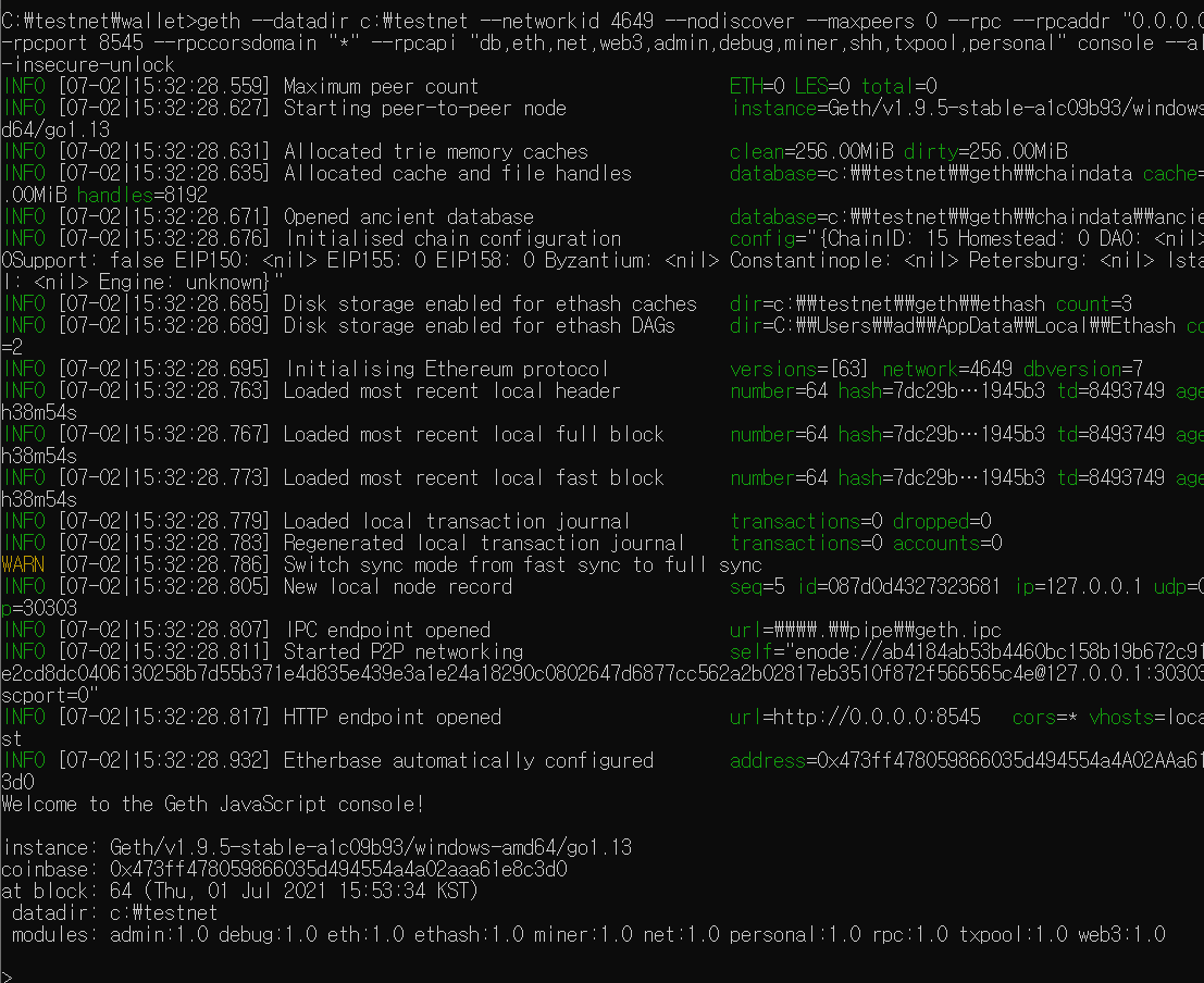 C:\Users\admin> geth --datadir c:\testnet --networkid 4649 --nodiscover --maxpeers 0 --rpc --rpcaddr "0.0.0.0" --rpcport 8545 --rpccorsdomain "*" --rpcapi "db,eth,net,web3,admin,debug,miner,shh,txpool,personal" console --allow-insecure-unlock