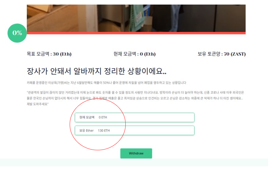 - 이 자영업자는 처음 100개의 토큰(ZAST)가 있었는데 첫번째 후원자에게 12개, 두번째 후원자에게 18개의 토큰을 후원 보상으로 지급하여 현재 70개의 토큰이 남아있는 것 또한 확인할 수 있다.