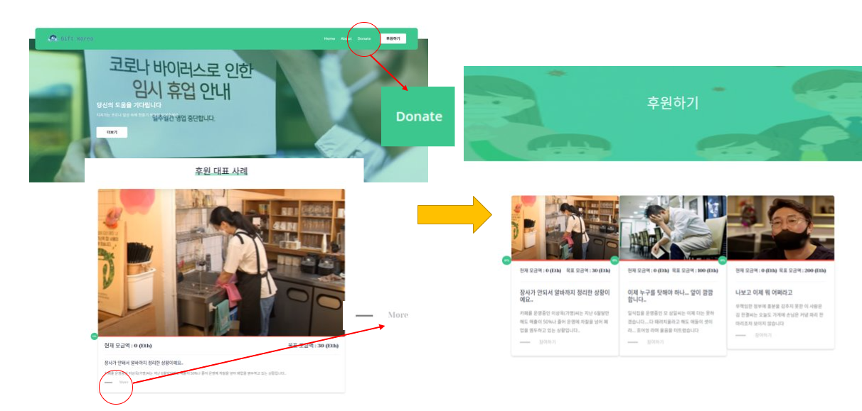 1) 메인화면 상단 메뉴의 “Donate” 를 클릭하거나 대표 후원사례의 “More”를 클릭하면 후원을 기다리는 자들의 리스트를 확인할 수 있다.