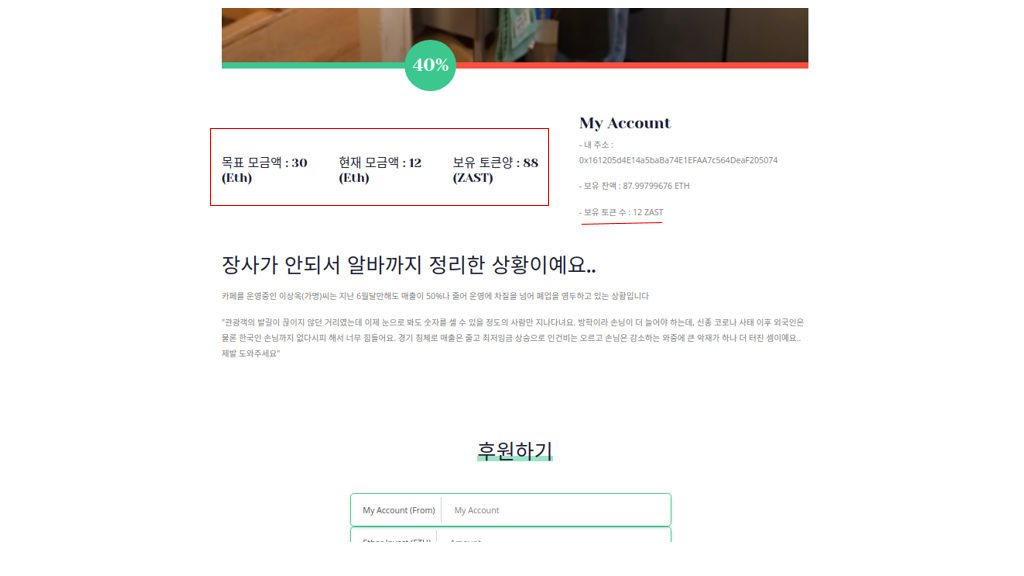 - 목표 모금액 30Ether중 12Ether가 모였으므로 모금 진행률이 40%로 변경된 것을 확인할 수 있다.