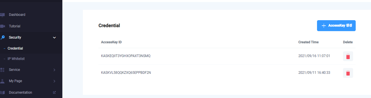 왼쪽 메뉴의 "Security" - "Credential"을 클릭하여 나오는 화면의 우측 상단에 AccessKey 생성 버튼이 있는데 이를 누르면 권한키 아이디가 바로 발급된다.