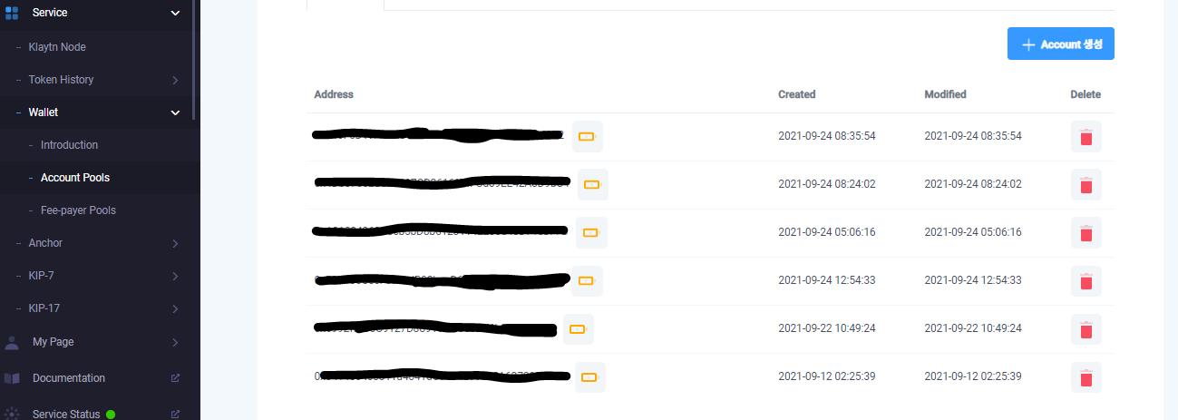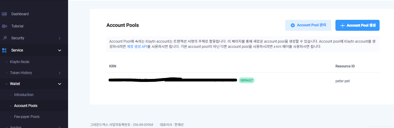 왼쪽 메뉴의 "Service" - "Wallet" - "Account Pools" 로 들어가서 account pool을 먼저 만들고